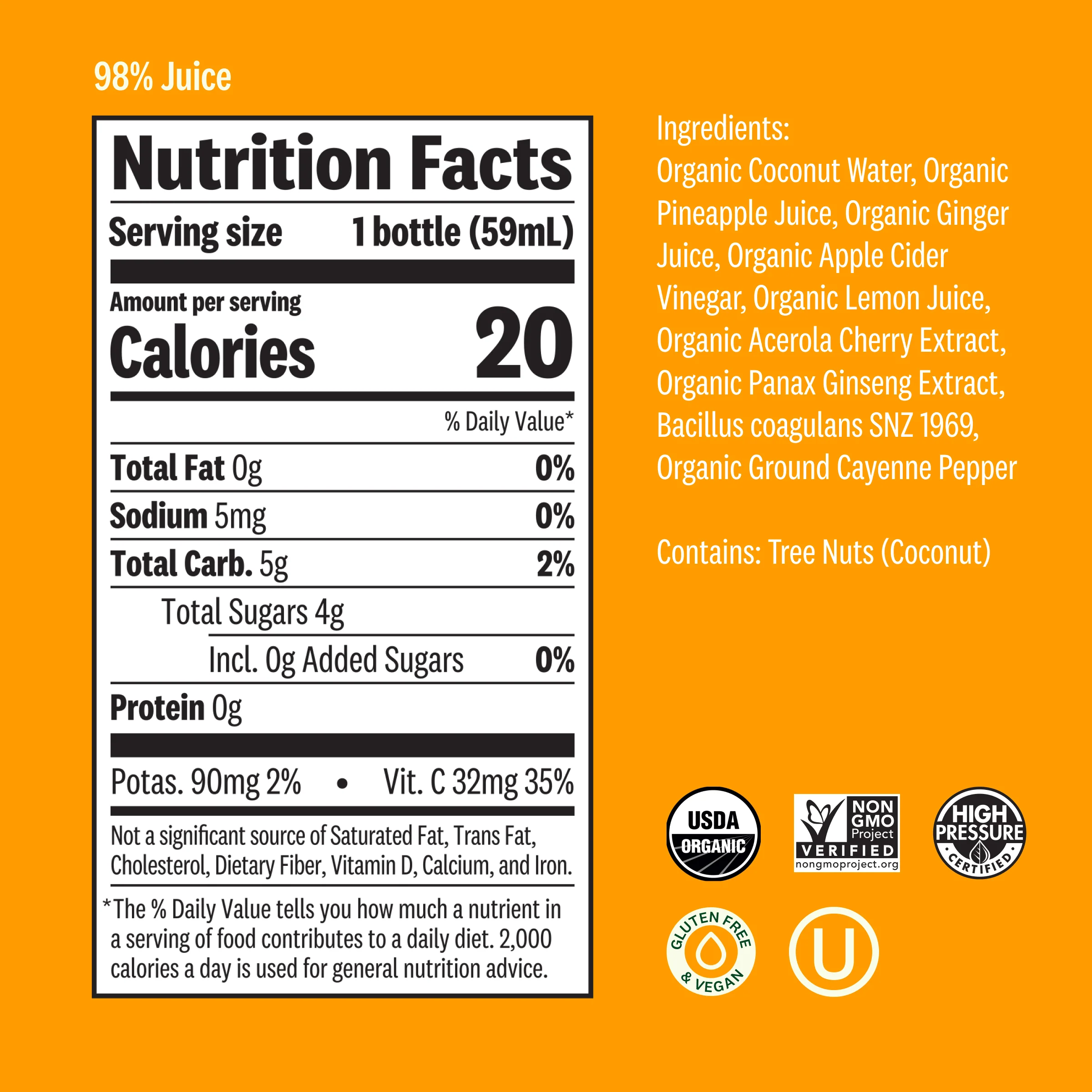 Support your gut health and add a little happiness with ginger, ACV, probiotics and a hint of pineapple. This zingy, fruity shot supports your insides, which shows on the outside. Big benefits. Tiny shot. Super tasty.